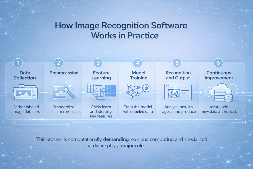 تُسدّ برامج التعرّف على الصور هذه الفجوة بتعليم الآلات كيفية ارتباط الأنماط المرئية بالأشياء في العالم الحقيقي. لا تحدث عملية التعلّم هذه مرة واحدة، بل تُكرّر آلاف أو ملايين المرات باستخدام أمثلة مُصنّفة حتى يبدأ النظام في التعرّف على الأنماط تلقائيًا.