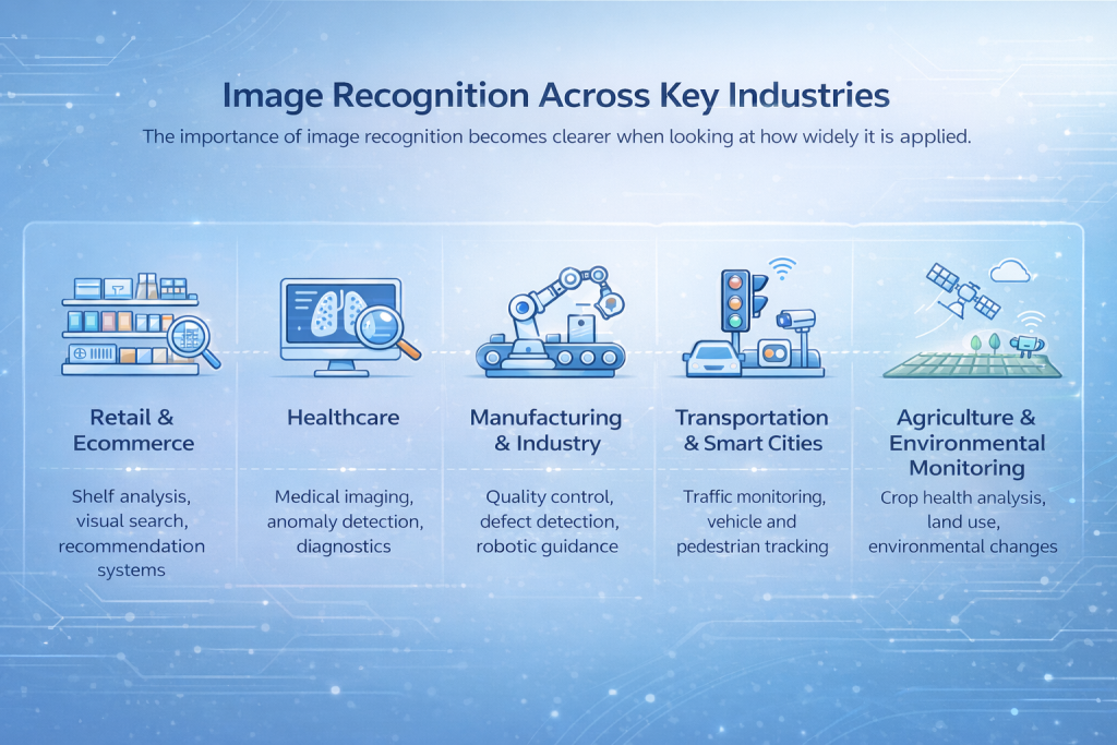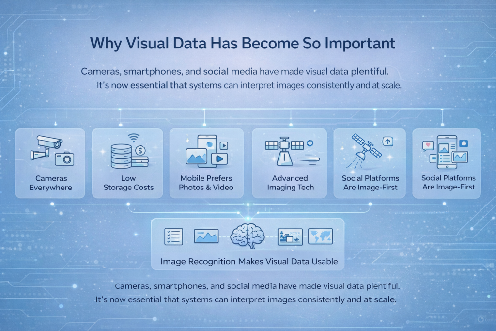 يُعدّ التعرّف على الصور أمراً بالغ الأهمية لأنّ الشركات الحديثة تُنتج كميات هائلة من البيانات المرئية تفوق قدرة البشر على معالجتها يدوياً. فالكاميرات والهواتف الذكية والطائرات المسيّرة والماسحات الضوئية تُنتج ملايين الصور يومياً. ويُتيح التعرّف على الصور الاستفادة من هذه البيانات من خلال أتمتة التحليل والكشف عن معلومات قيّمة كانت ستبقى خفية لولا ذلك.