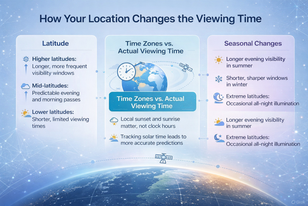 En latitudes más altas, el crepúsculo dura más, lo que significa que los satélites pueden permanecer iluminados por el sol mucho después de que el cielo se oscurezca. Esto suele resultar en ventanas de visión más largas y, a veces, múltiples pases visibles en una noche. En latitudes más bajas, el crepúsculo es más corto, lo que limita el tiempo que los satélites permanecen visibles.