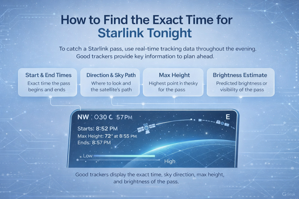 Saber la hora es solo la mitad del trabajo. Saber dónde mirar es igual de importante, especialmente para quienes lo ven por primera vez. Los satélites Starlink rara vez pasan directamente sobre la Tierra, a menos que el rastreador lo indique específicamente.