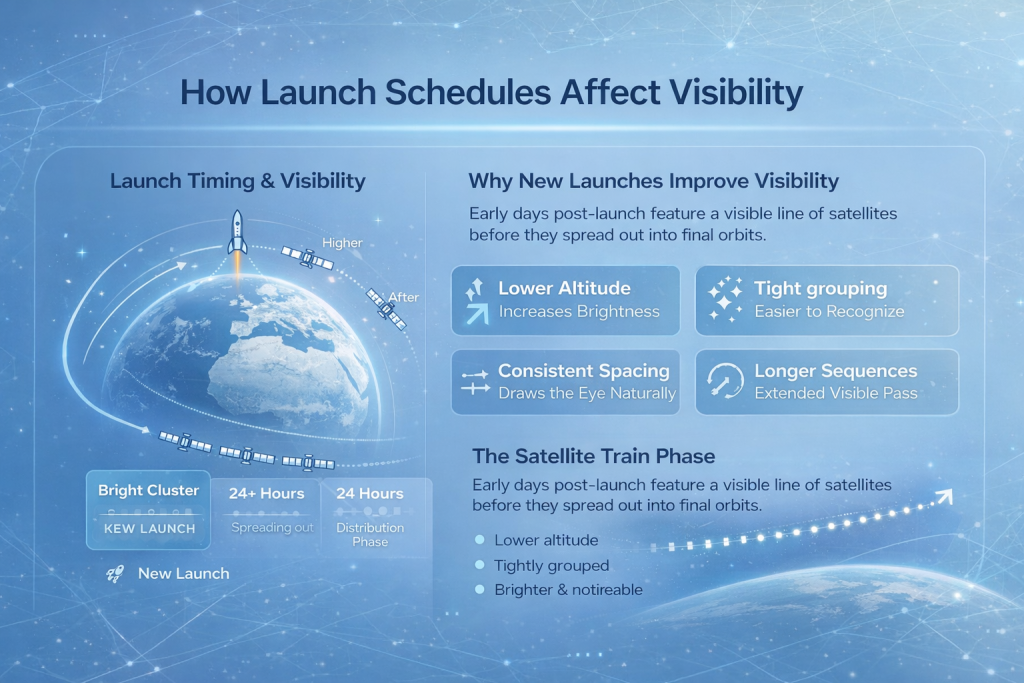 En los días posteriores al lanzamiento, los satélites aparecen en una formación compacta que se desplaza suavemente por el cielo. Esto crea el conocido efecto de tren de satélites, que la gente suele grabar y compartir en línea. Con el tiempo, este impacto visual se desvanece a medida que los satélites se dispersan.