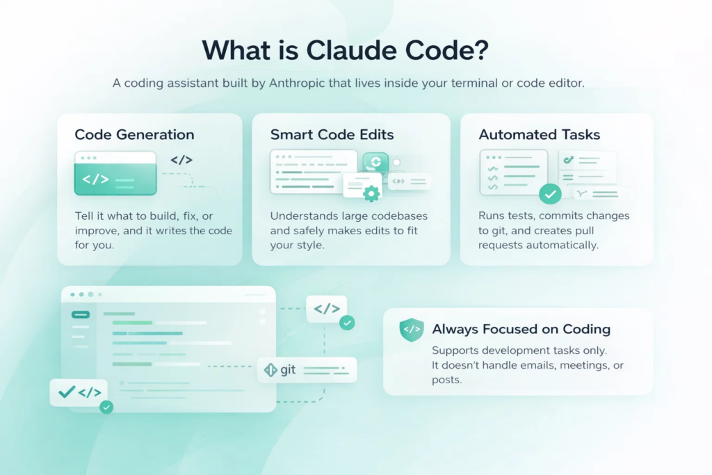 Claude Codeはコーディング作業のみに機能します。メールを読んだり、会議を予約したり、ソーシャルメディアに投稿したりすることはありません。開発環境内で機能する、非常に有能なコーディングヘルパーとして機能します。.